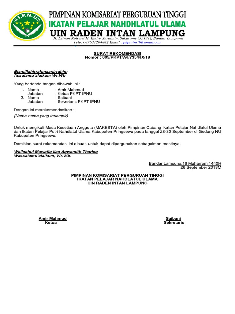 Format urat rekomendasi mendaftar studi biasanya telah disiapkan oleh pihak panitia pendaftaran contoh surat rekomendasi nu. Surat rekomendasi merupakan suatu dasar penilaian terhadap kapabilitas maupun kinerja seseorang.